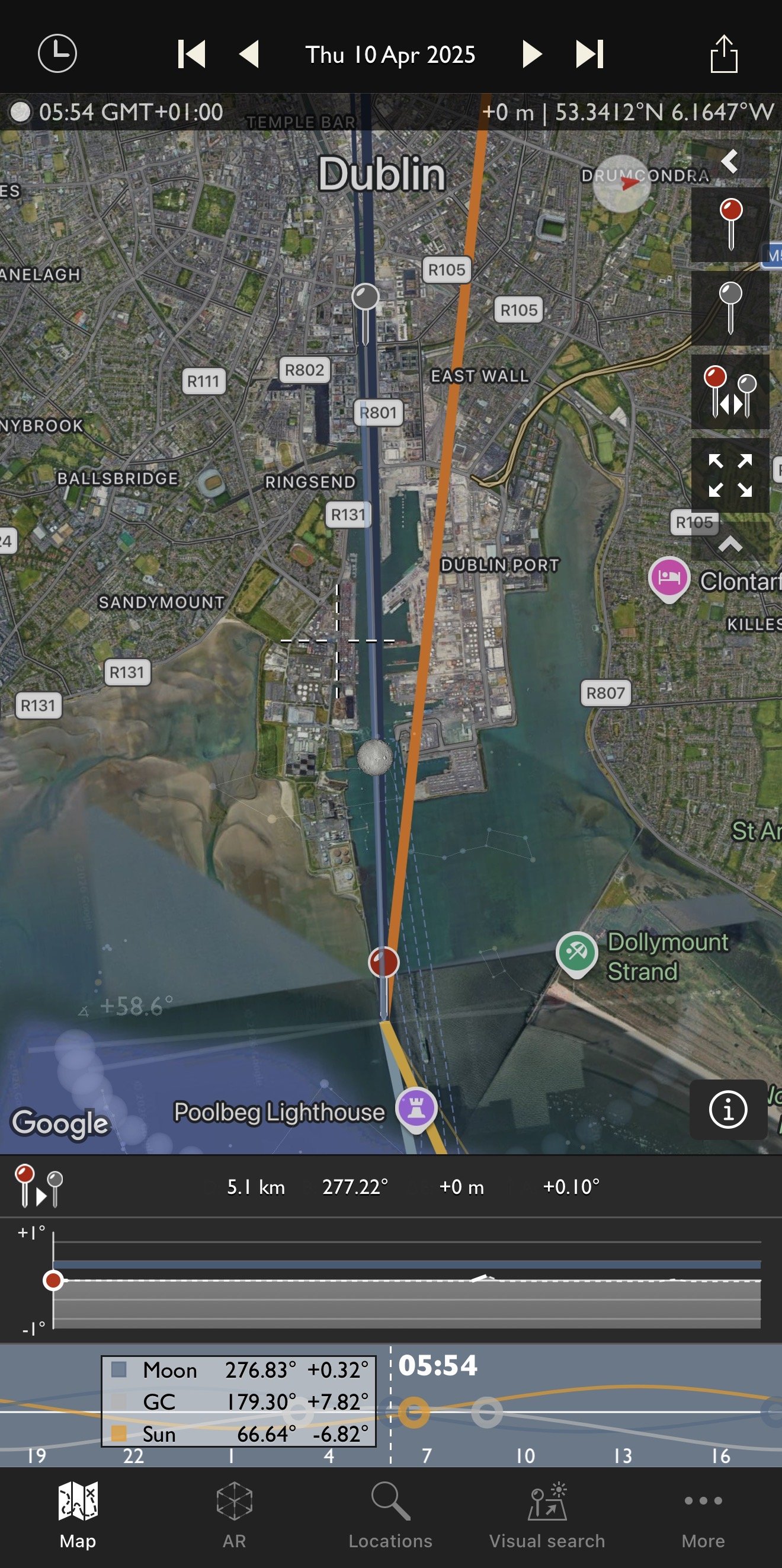 Screenshot of the plan to align the moonset with the Samuel Beckett Bridge from the Half Moon swimming club on the Great South Wall on 10th April 2025 using The Photographer’s Ephemeris app. This app has a €10 one time purchase fee. Other similar apps include PhotoPills and PlanIt Pro.