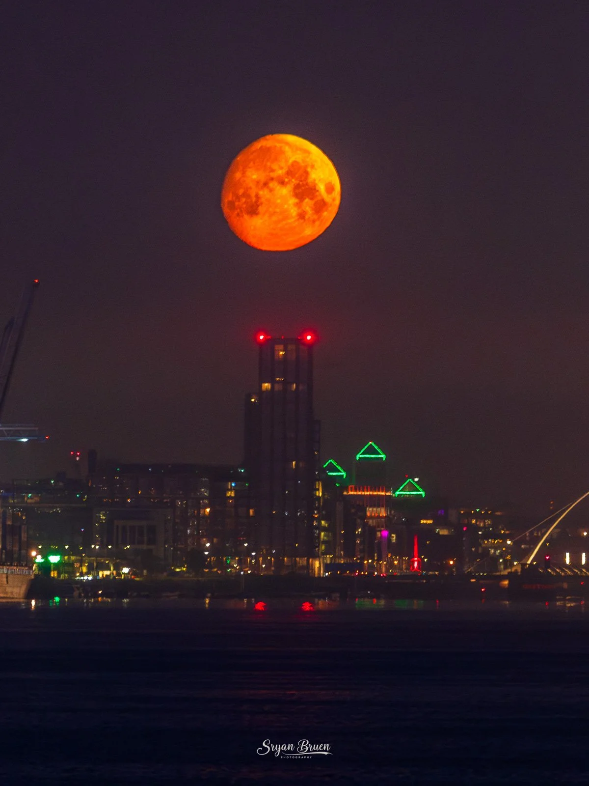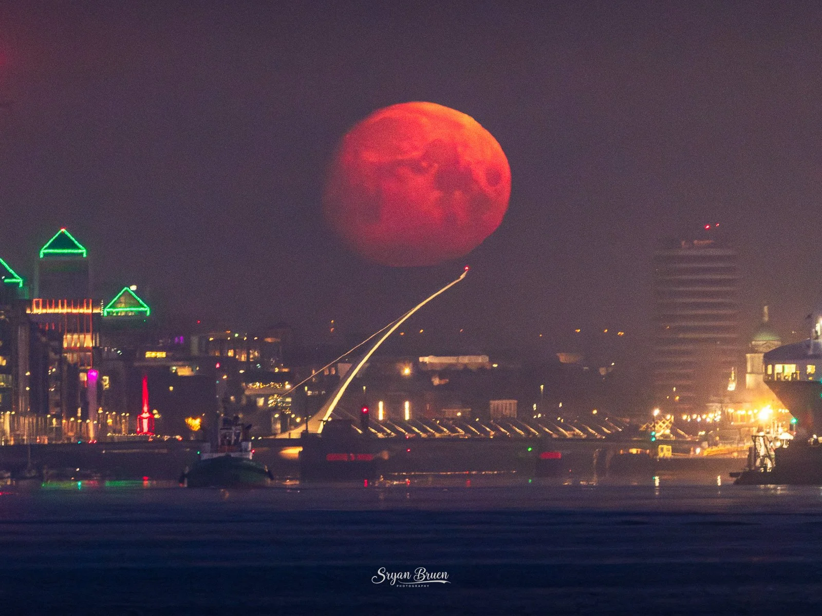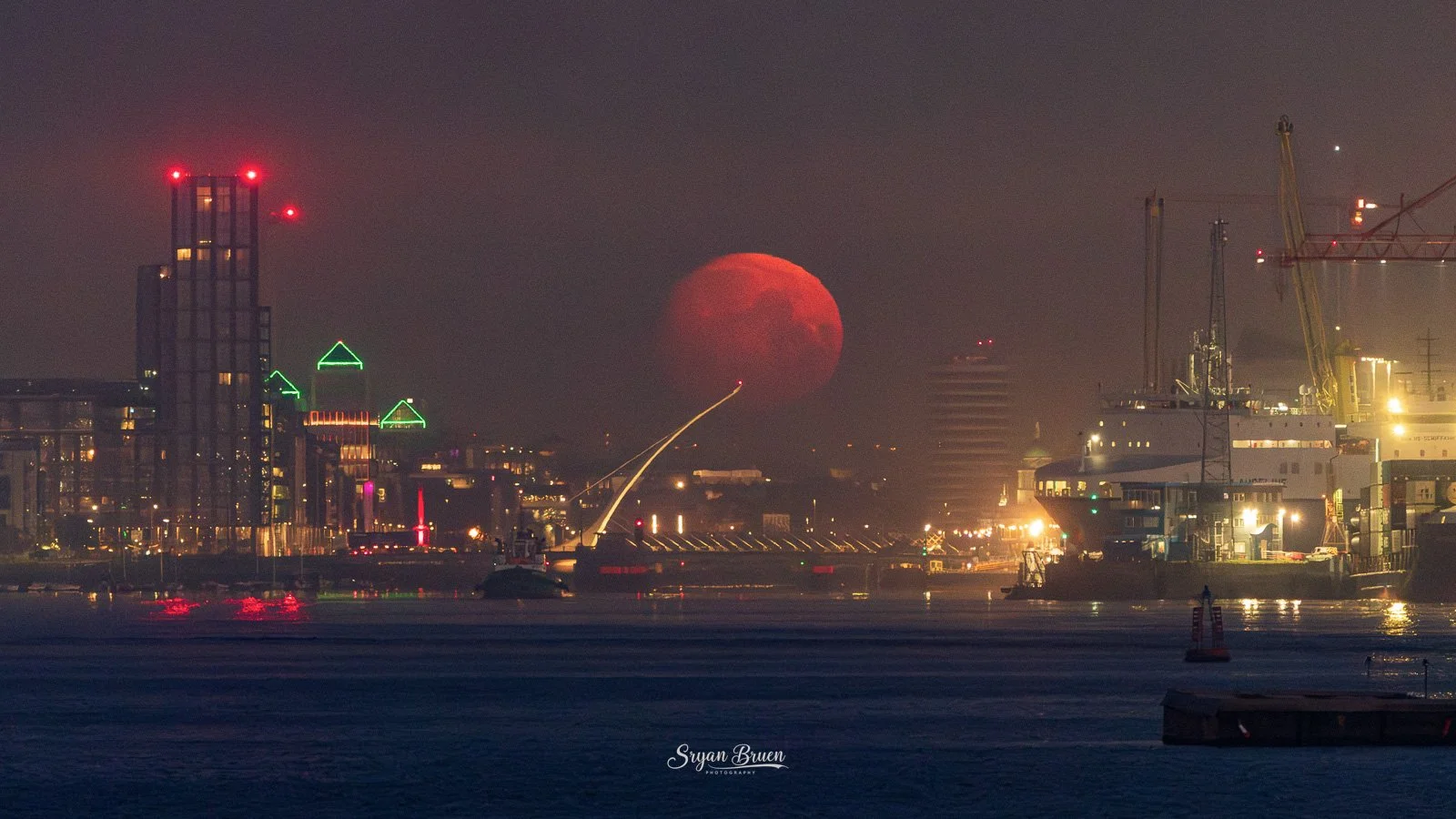 Waited for the moon to get more into position setting lower in the sky. As you can see from the different images, the moon got hazier and more muted as it descended through the sky. It was a red disc when it hit the Samuel Beckett Bridge. The inland mist did its job very well by muting the earthshine despite how dark it still was. If anything, it did its job TOO well because the moon became very hazy with not much structure to photograph losing detail of its craters. It can’t all be perfect, not to mention there was a ferry departing Dublin Port which nearly completely blocked our view of the moon! What we witnessed was wonderful enough and a moment not to forget. It was honestly up with the October 2024 aurora and June 2025 noctilucent cloud displays for the most beautiful things I’ve seen nature produce. I wish I had a better tripod which wasn’t strong enough to withstand the camera shake from the heavy lens and the little bit of breeze there was but you have to make do with what you have at a given time.