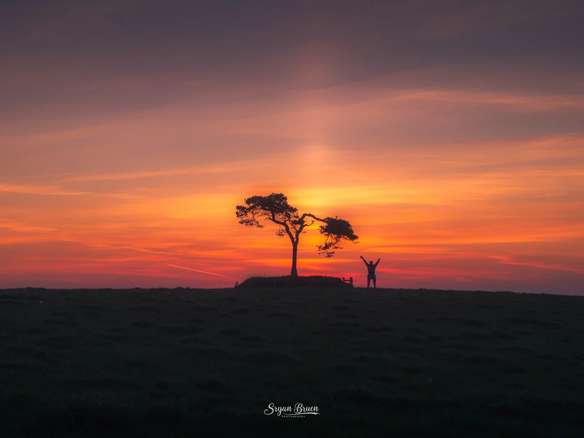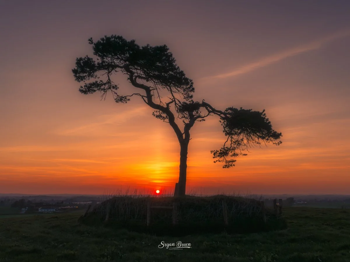 Sunset at the Fairy Tree, Knockbridge with a sun pillar visible. Captured using a Nikon D7500 with an 18-55mm f3.5-5.6 lens and the following settings ISO-100, 1/500th of a second, f/8.0 @ 18mm.