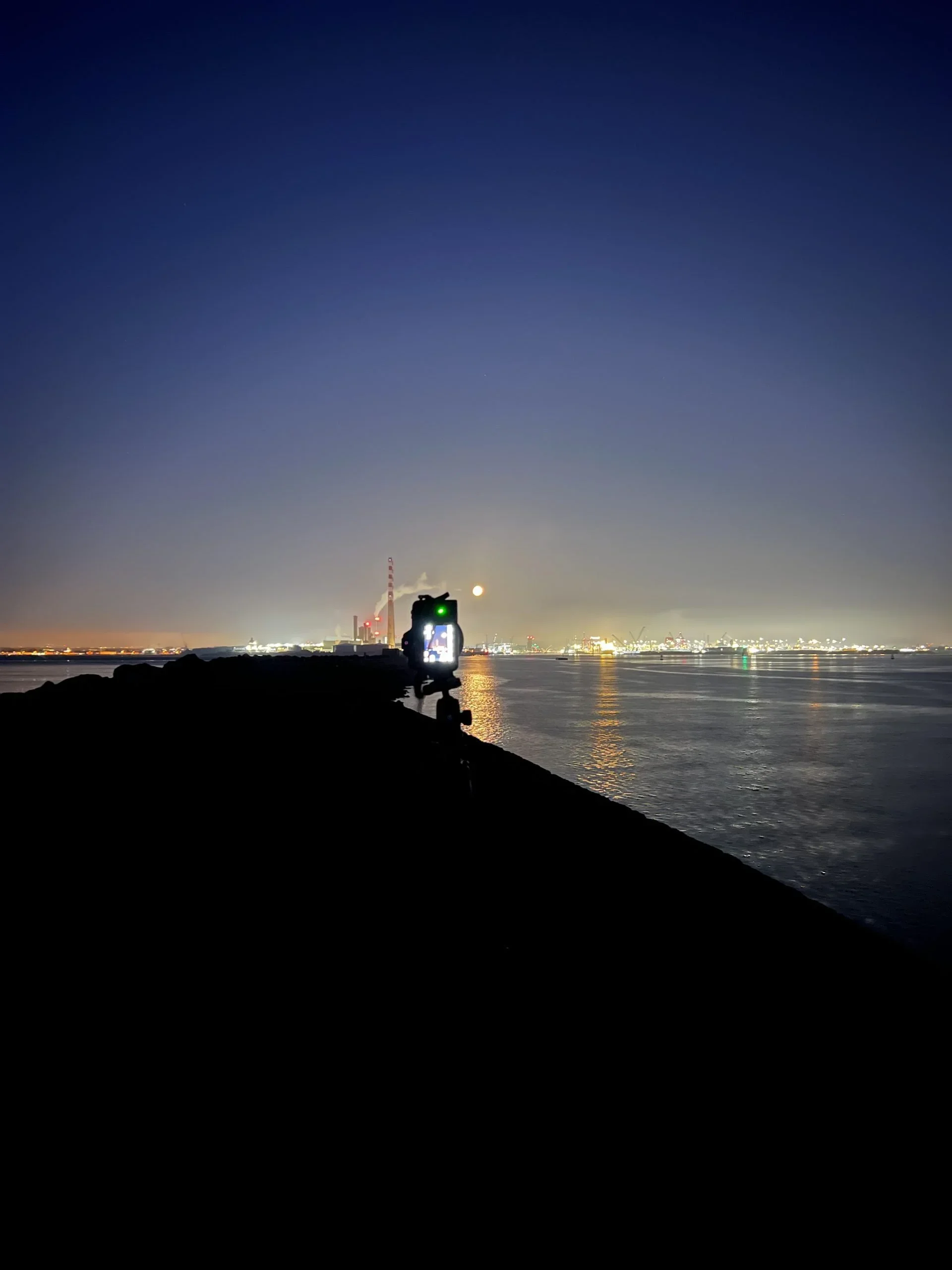 My camera capturing the moonset live at the Great South Wall. Note how small the moon is in frame when you’re not zoomed all the way in! You can just about pick up the Capital Dock building with the red glowing lights at the top in the distance - this building is zoomed in on the next pic below. You can also spot the fog and mist near the horizon versus higher in the sky which is clear.
