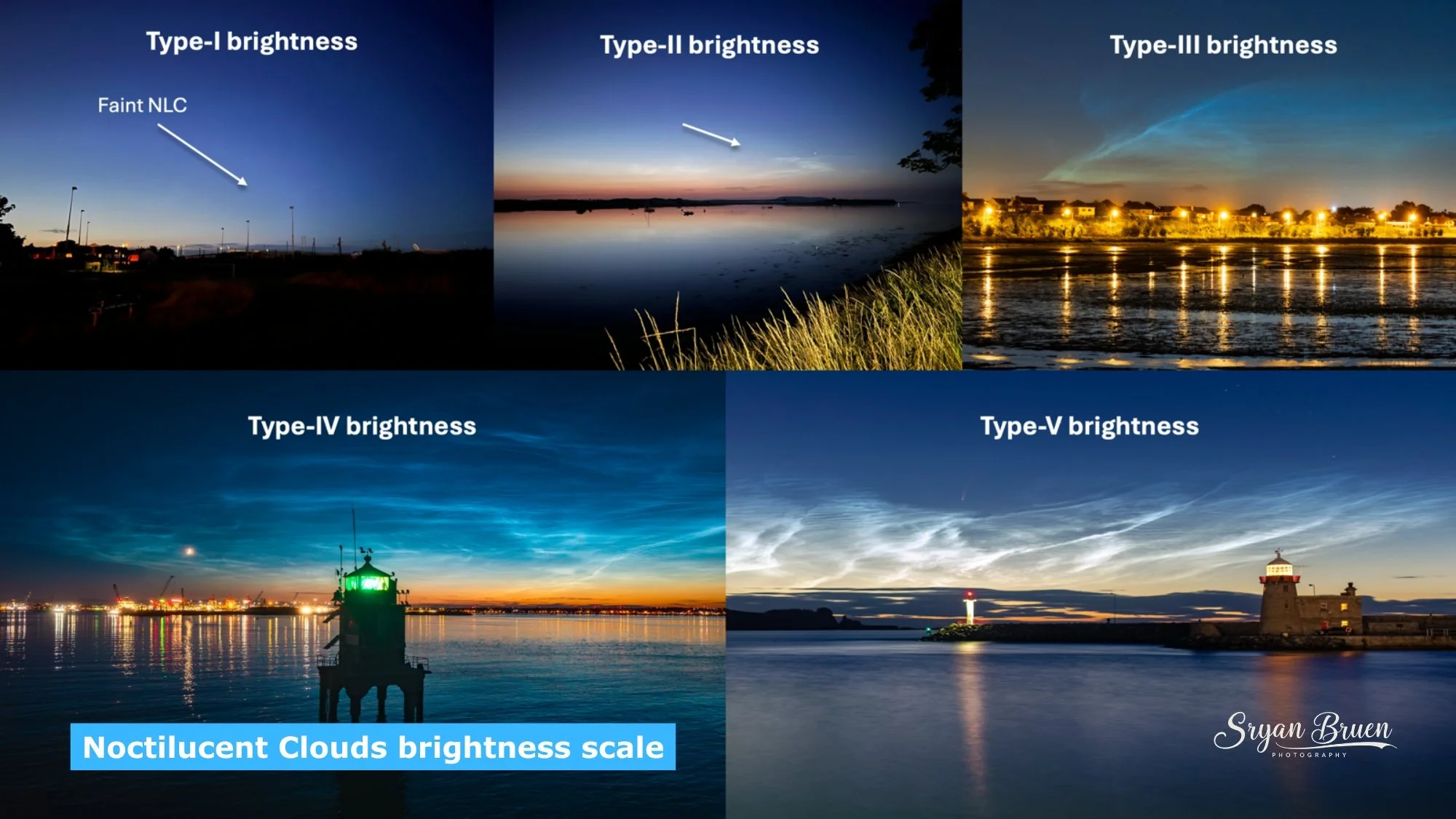 The intensity of noctilucent clouds is referenced using the five point scale from type-I to type-V depending on how bright the clouds are. Some examples can be found below. This can change dramatically over the course of the same display.