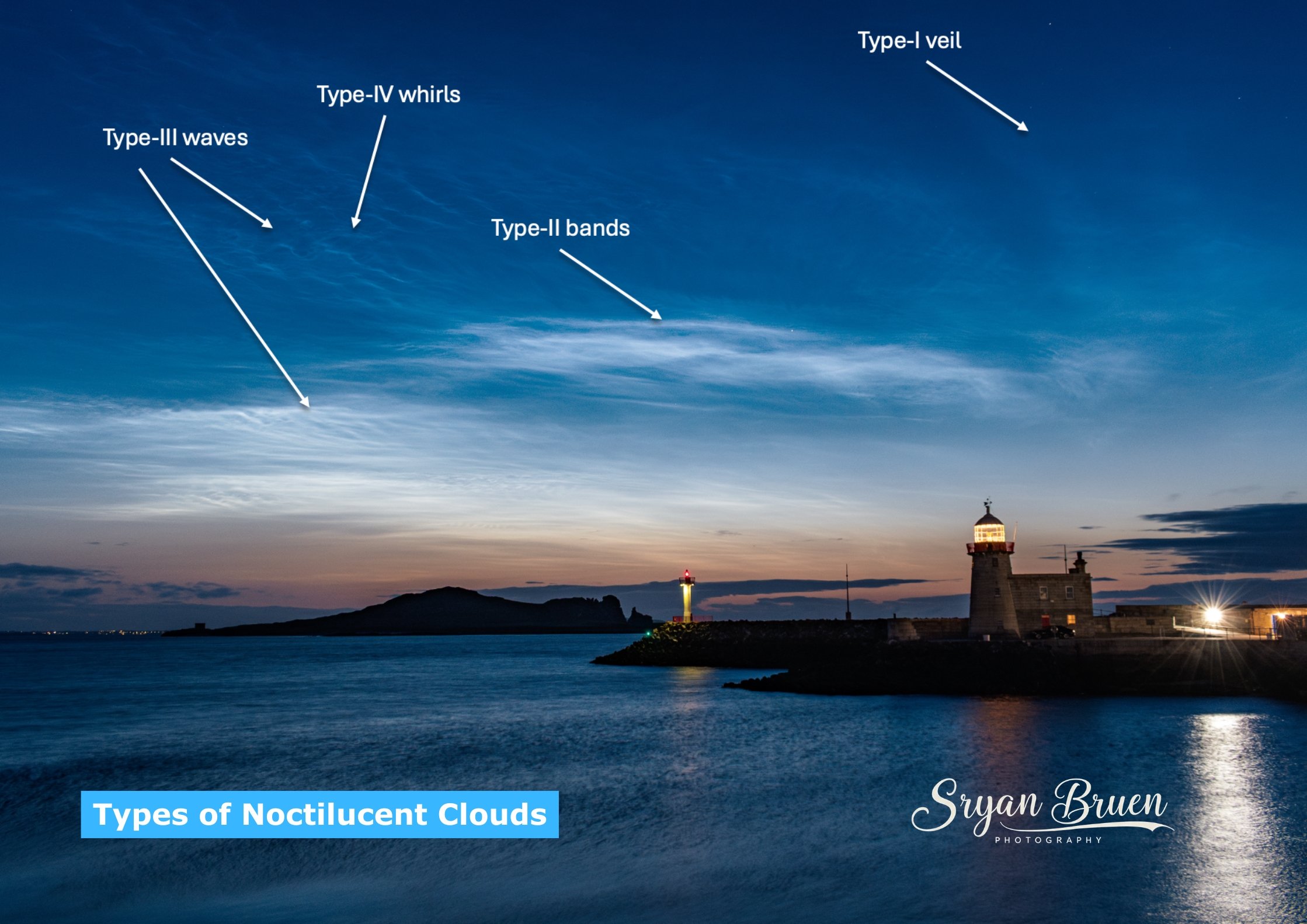Noctilucent clouds can also come in different shapes and formations. The basis of these types are illustrated in the diagram below. These can also be categorised into sub categories to classify very particular variations or shapes of the types.
