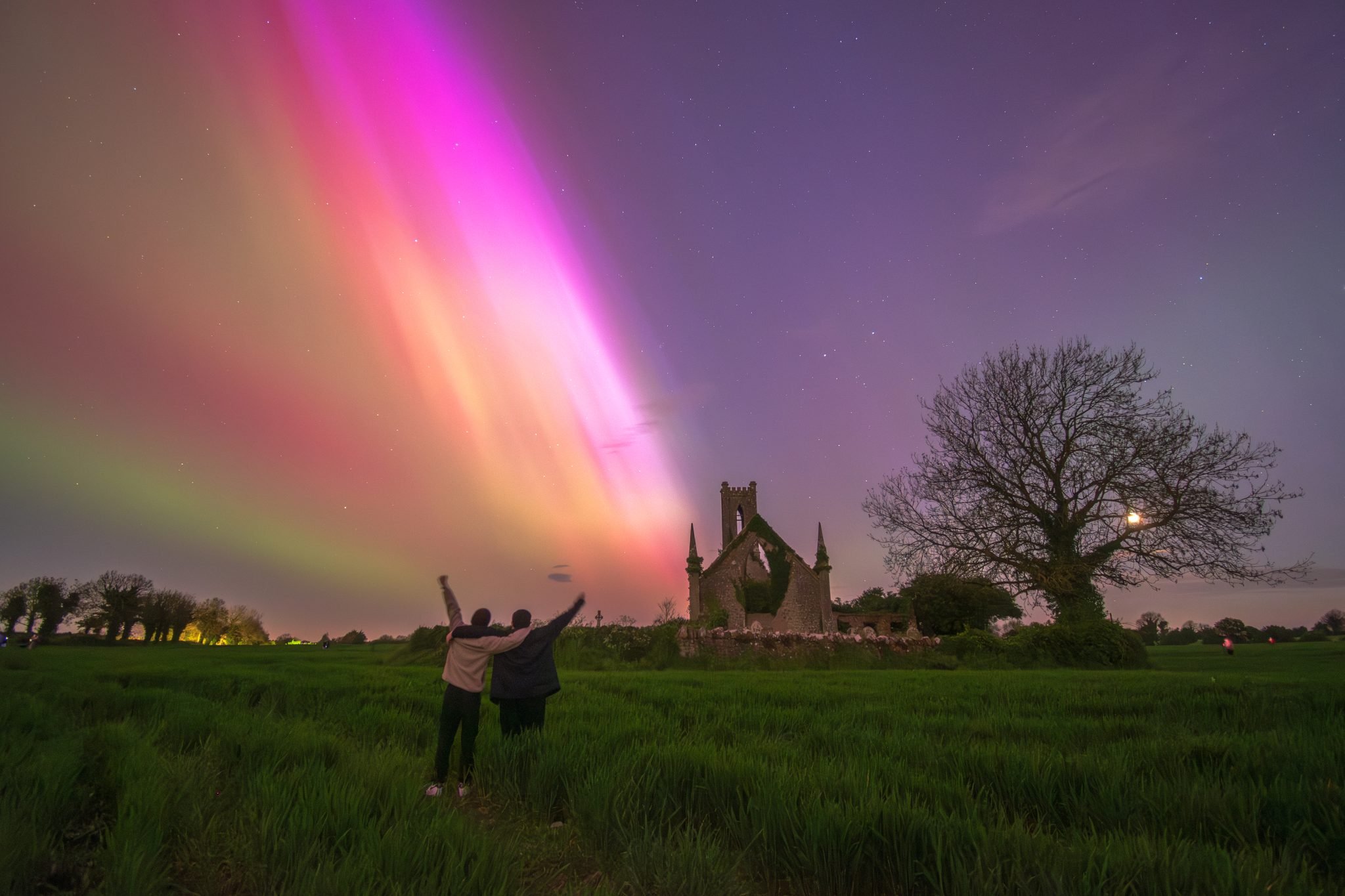 My friend and I posing in front of the aurora and Ballynafagh Church.